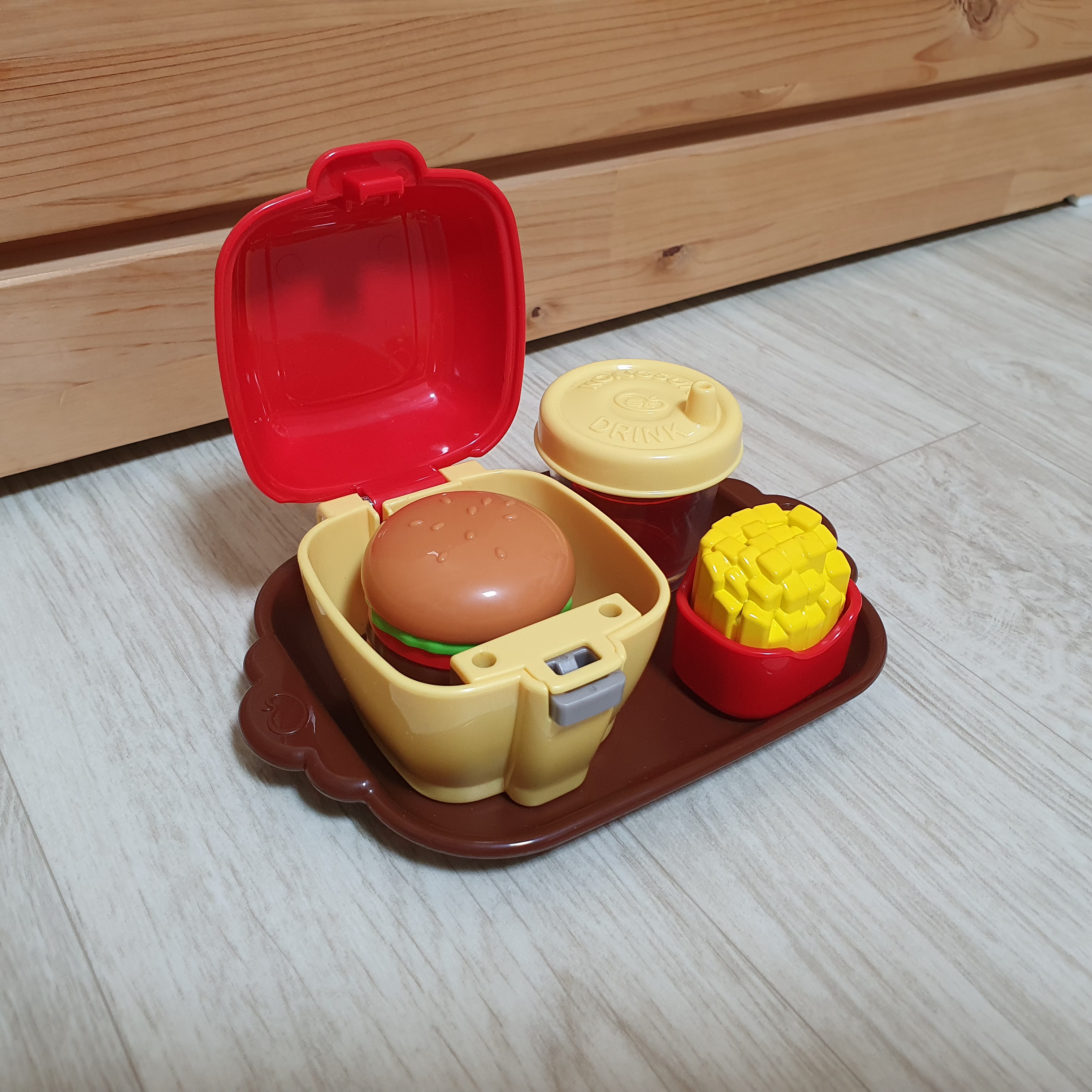 콩순이 햄버거 자판기로 주문할 수 있는 햄버거 세트입니다. 실제 햄버거 세트처럼 햄버거, 감자튀김 그리고 음료로 구성되어 있어요. 실제 햄버거 세트를 먹어본 수원 어스네 알라는 자신의 장난감이 실제 햄버거 세트와 같으니 참말로 좋아했어요.